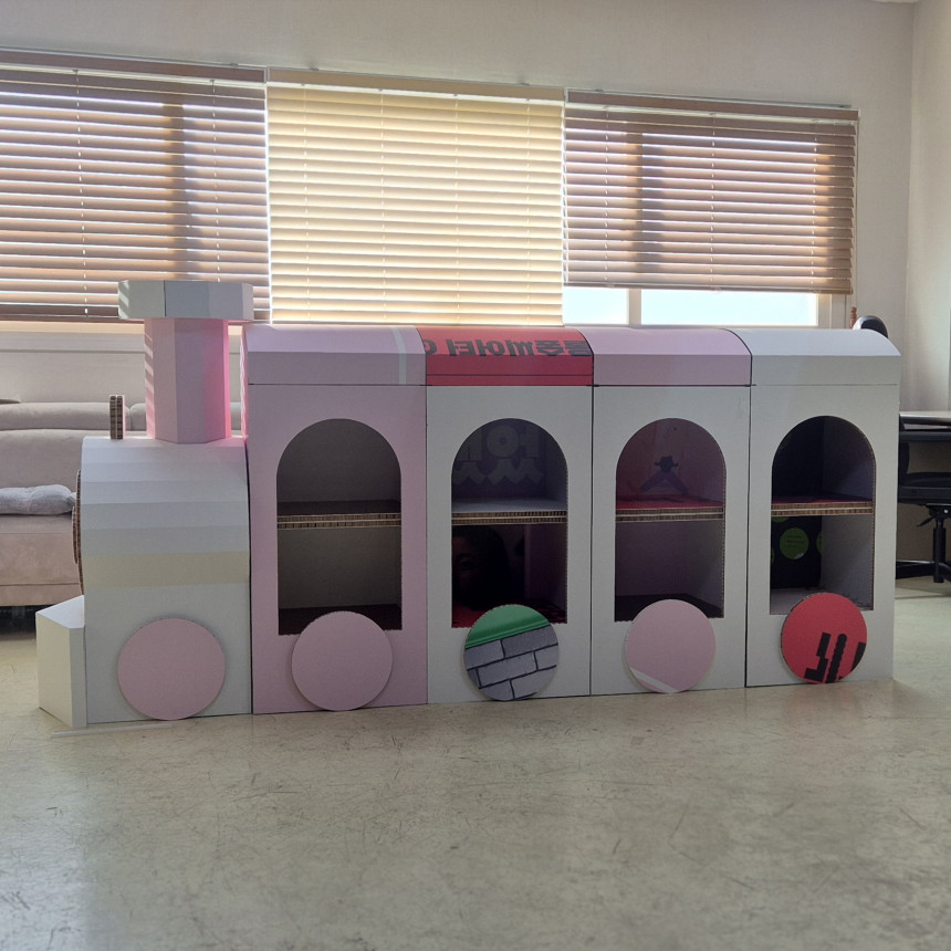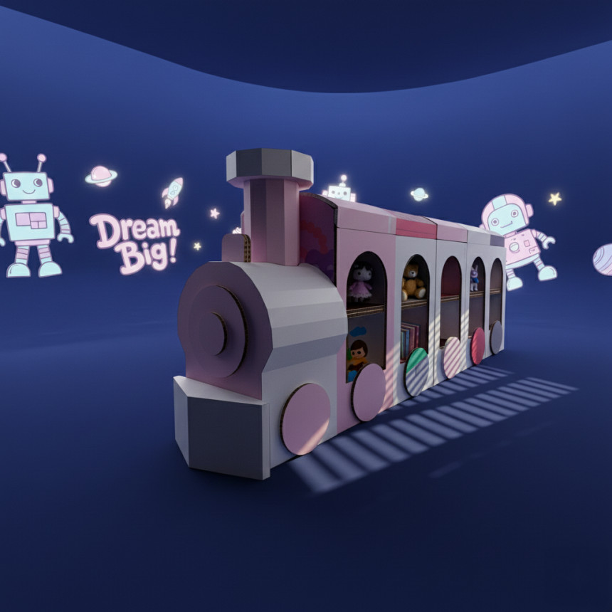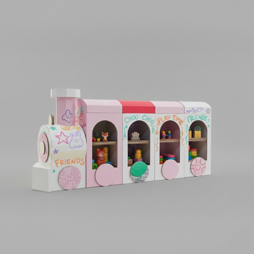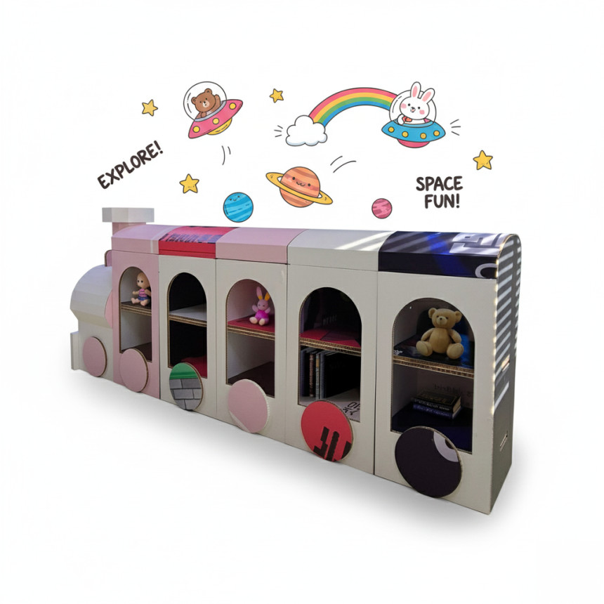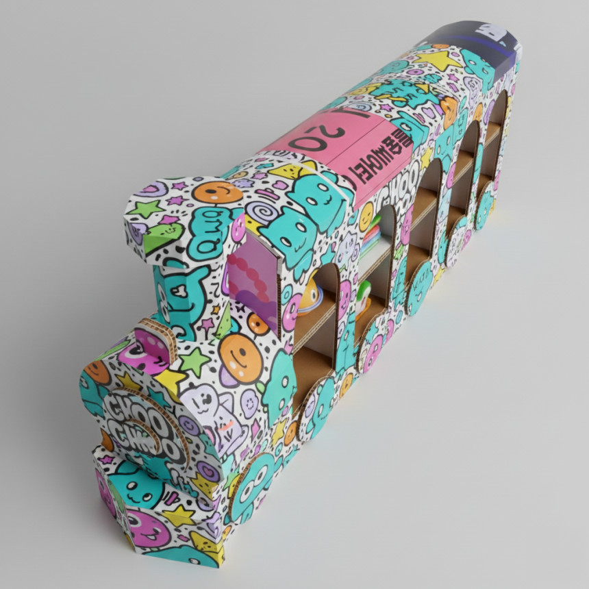 기차 형태로 제작된 허니콤보드 수납형 책꽂이입니다.
